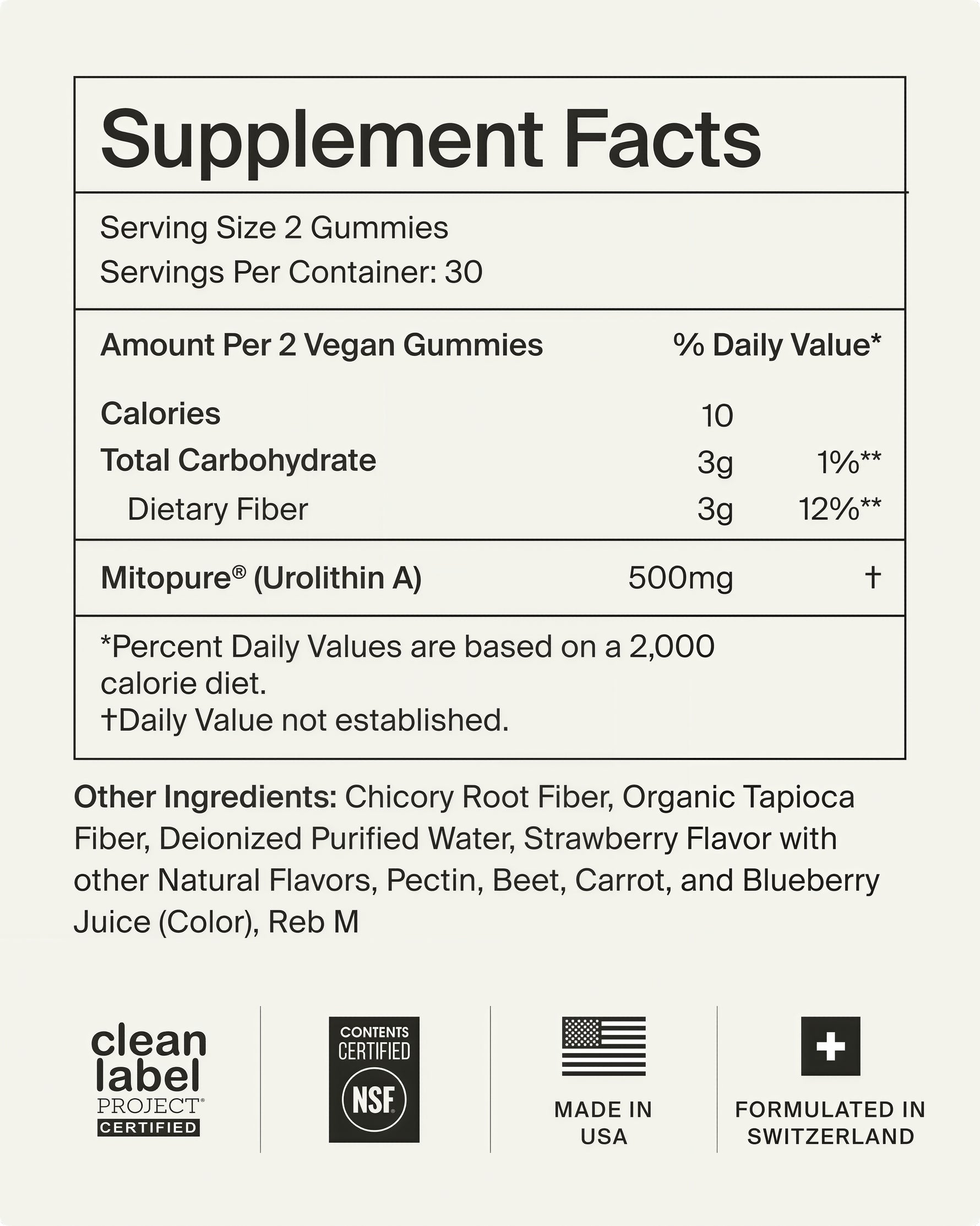 arget signs of aging at the source with Mitopure in a new, sugar-free strawberry gummy. Two gummies provide the recommended dose of Urolithin A (500 mg of Mitopure).